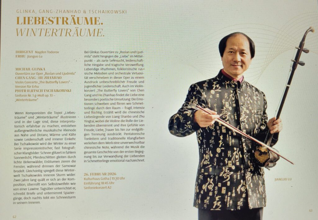 am 26.02.2026 19.30 Uhr Konzert im Kulturhaus Gotha „The Butterfly Lovers“, Thüringen Philharmonie Gotha-Eisenach mit chinesischer Geige ( Erhu )